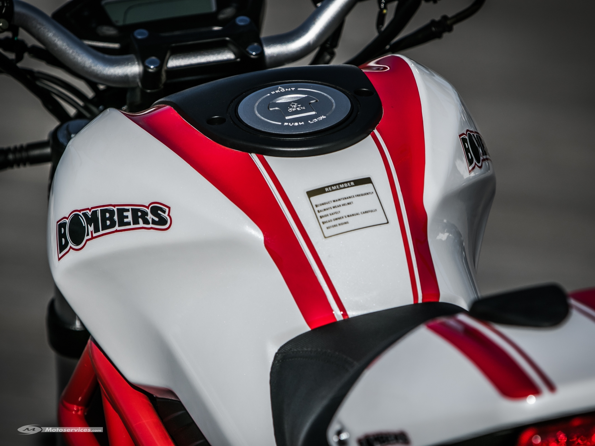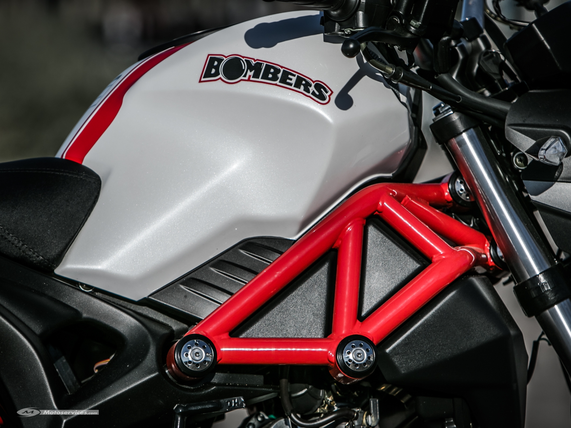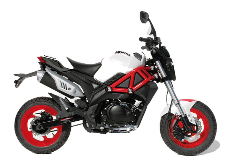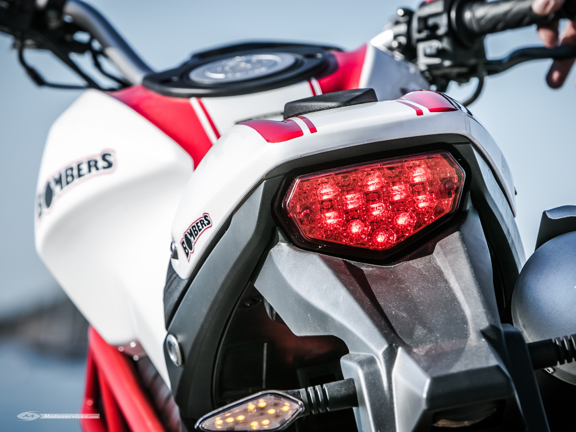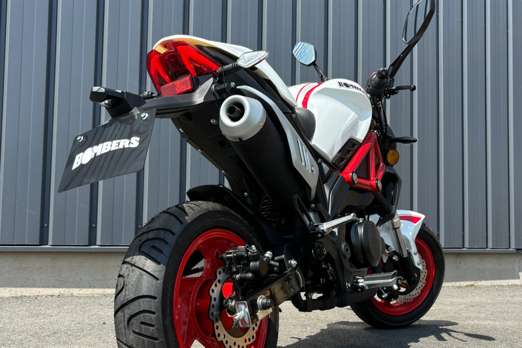 La Bombers 125 cm3 offre un freinage couplé (CBS) à disque wave avant et arrière, et une tenue de route exceptionnelle pour une conduite en toute sécurité. Customisable à souhait, elle a tout d’une grande : fourche inversée, pneus larges, éclairage full LEDs, tableau de bord digital complet, look racé d’inspiration italienne… La Bombers 125, c’est du fun à l’état brut : avec son moteur de 6.8 kW (9.2 ch), elle est à la fois agile et réactive notamment en couplant la puissance avec un poids réduit de 103 kg. Très accessible grâce à sa hauteur de selle sous la barre des 750mm, elle permet même aux petits gabarits de s’offrir un plaisir en 125 ! La Bombers 125 est homologuée 2 places, ce qui fait que vous pouvez partager le plaisir de conduire un 2 roues avec un passager.