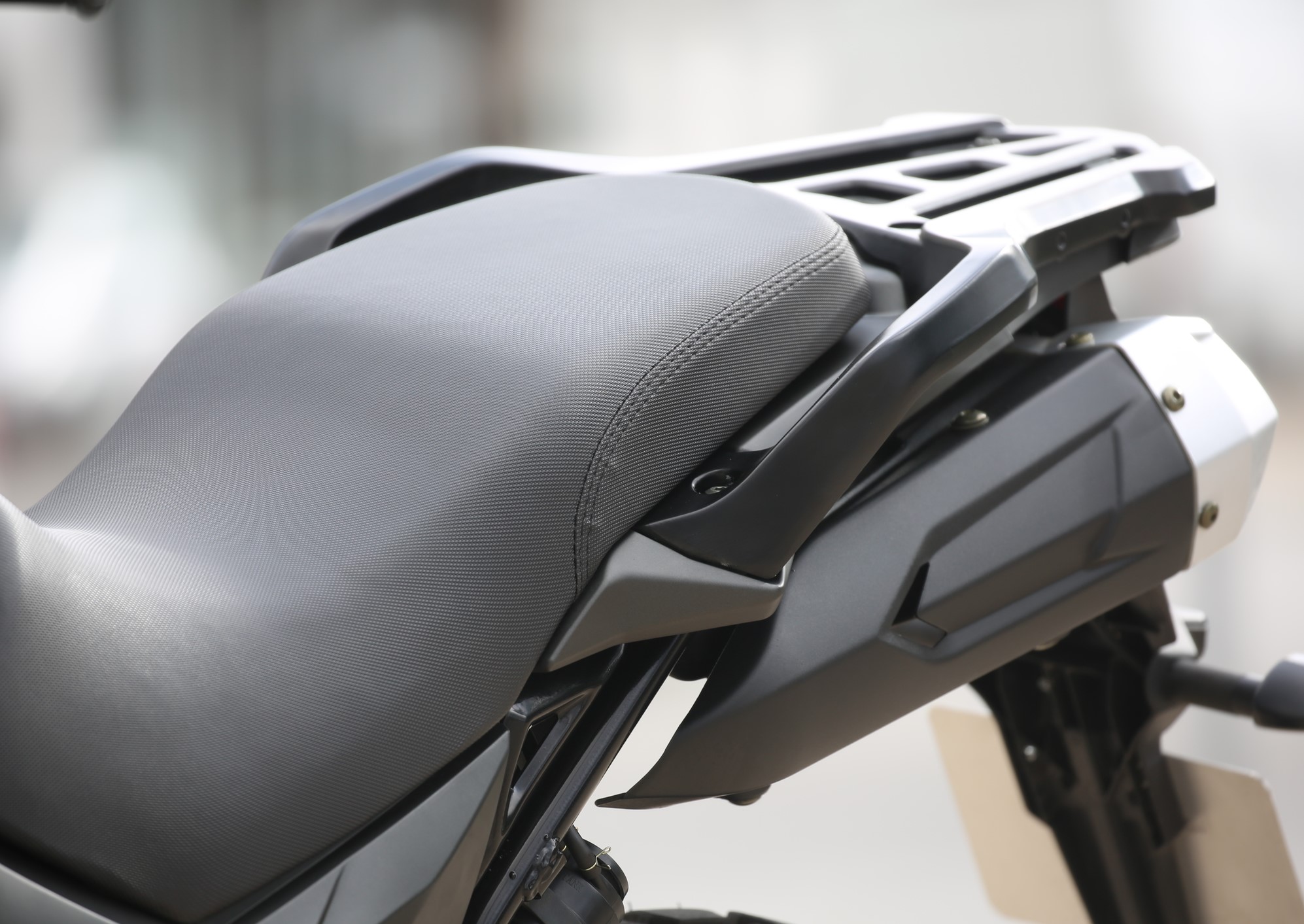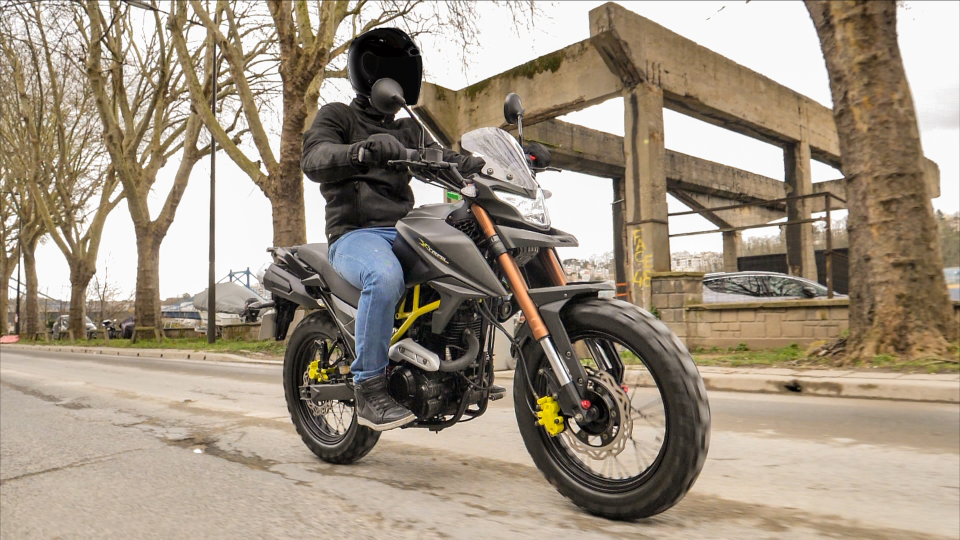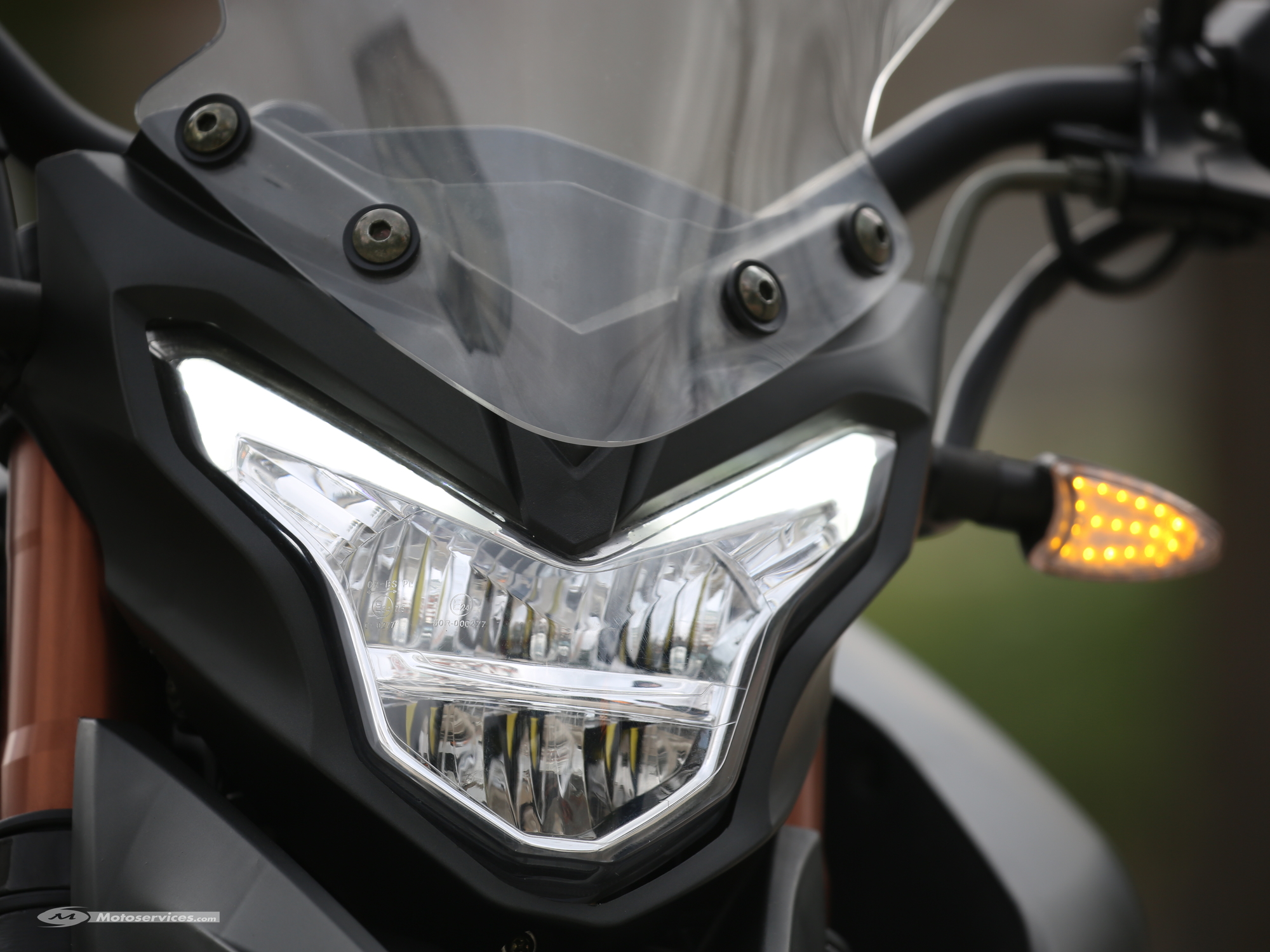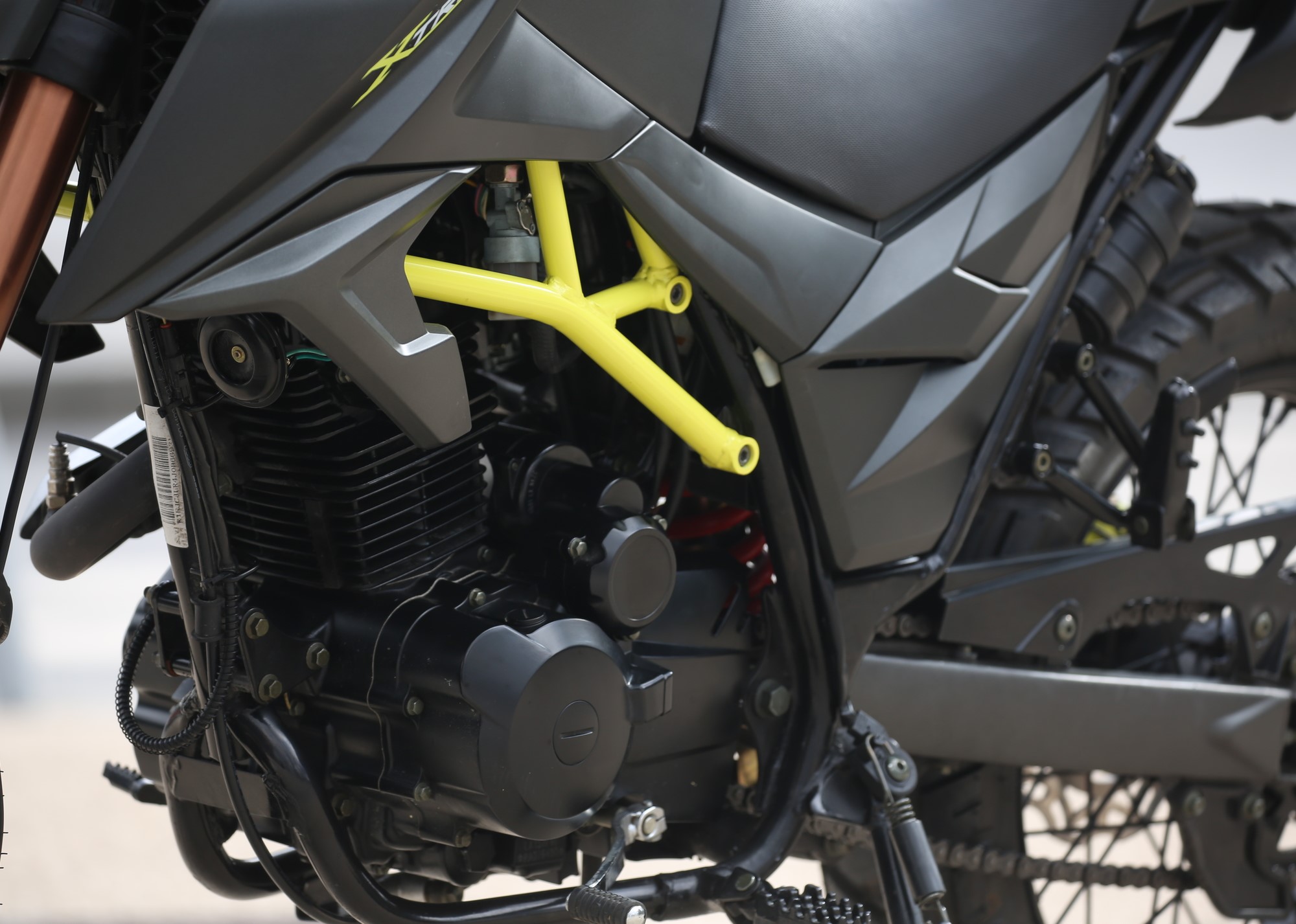 La X-Trail 125 se fait immédiatement remarquer sur la route avec ses étriers fluo et son châssis rappelant un super motard ou un trail baroudeur. La finition bronze des fourreaux de fourche ajoute au charme du X-Trail. Elle reprend également tous les éléments d’une aventurière : jantes à rayon, hauteur de selle de 820 mm, suspensions à grand débattement,